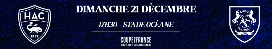 Coupe de France / HAC - Amiens le 21/12 à 17h30 La rencontre de Coupe de France entre le HAC et Amiens (1/32ème de finale) se jouera le dimanche 21 décembre à 17h30 au Stade Océane. -